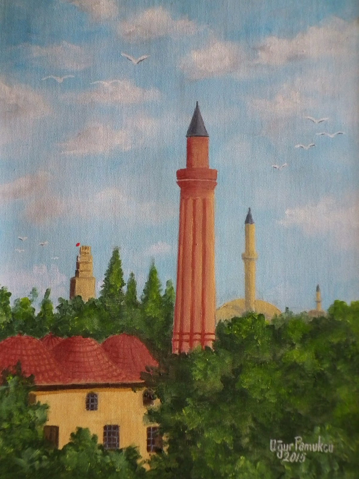 sanatsal etkinliklerim antalya saat kulesi yivli minare yagli boya the fluted minaret mosque and clock tower in antalya oil painting